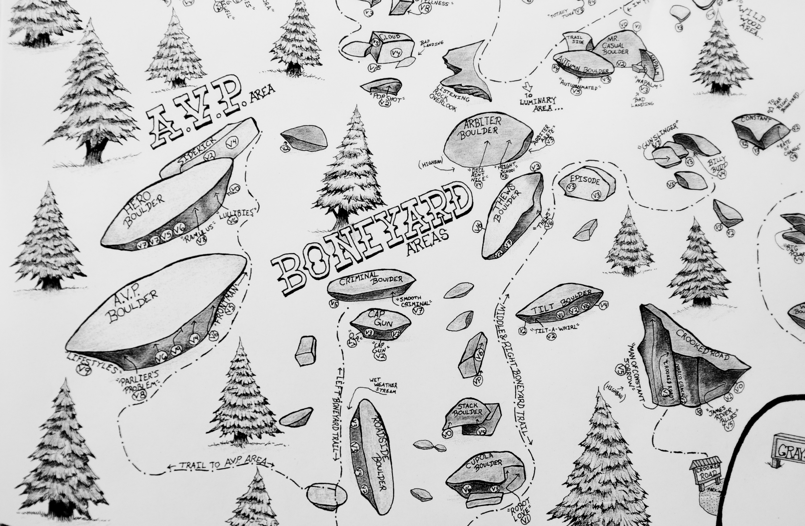 with pen in hand, I put ink to paper and it was on. I worked on the map for two weeks and decided it wasn’t what I wanted and trashed it. Round two, I flipped the paper to a lengthwise landscape and was able to format it to suite the cascade of boulders better and to get the mountains of VA and NC in a more balanced position. This allowed me to capture over 200 various (popular and obscure) boulder problems and allude to new boulders and areas that are now under development.