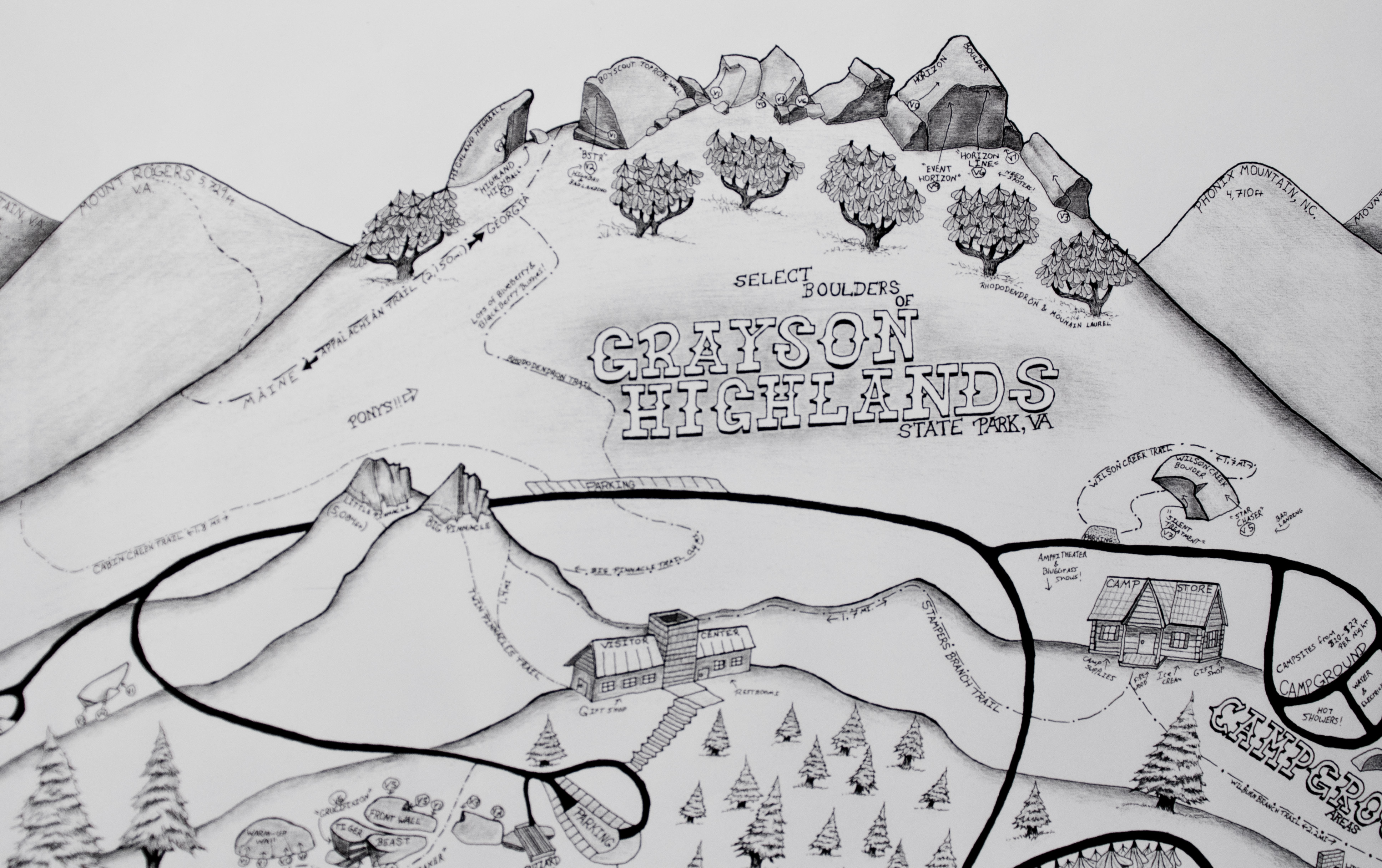 Creating a large-scale landscape drawing of the boulderfields of Grayson Highlands State Park is something I have always wanted to do since first laying eyes on the awesome Lineville Gorge prints by Joey Henson. I have always stared at the maps Joey illustrated and thought that “one day” I would do something like this. After moving here to Boone and seeing Jeffery Bonatti’s awesome work on the Ruff Guide map of the park, I decided to finally start something of my own.