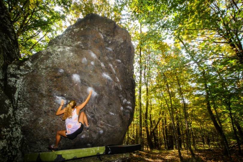 Brianna Knaggs reaching through to the next crimps on “Ranger Rick Sit”(V4)