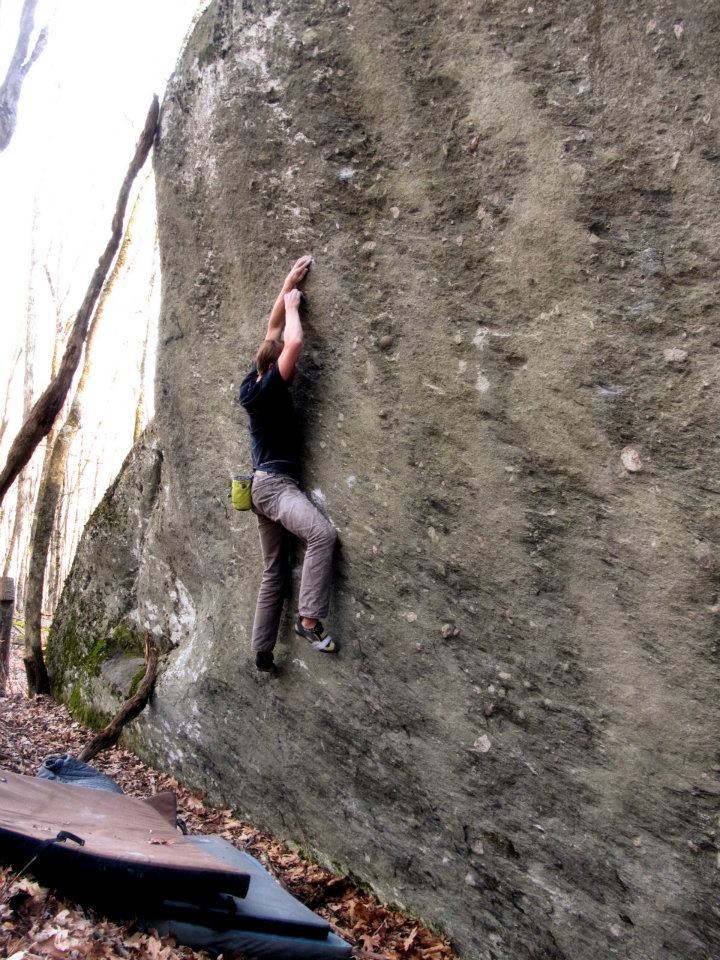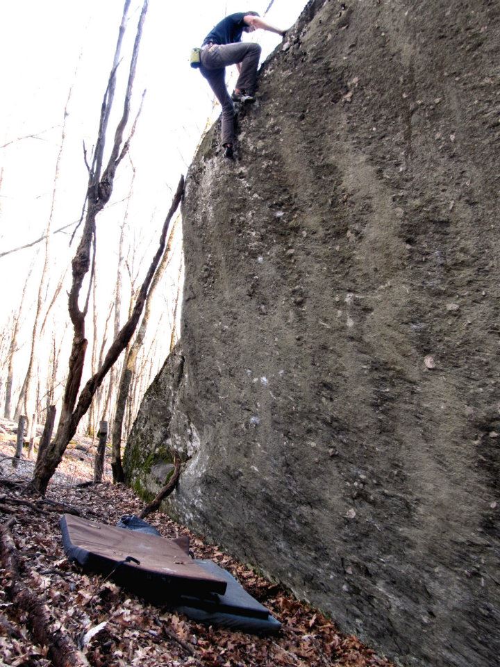 This is followed by the “gunslinger move” which is a large, fleeting, Hail Mary toss to the nice fin jug at the tip of the boulder (and avoiding the deal breaker dab on the adjacent boulder as you orbit out). From there, a toss over mantle press-out gives way to victory.